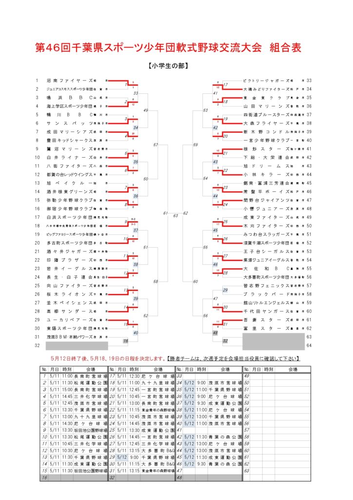 - (終了)第46回千葉県スポーツ少年団軟式野球交流大会 兼 第43回関東大会予選会 3月24日(酒々井町の代表戦)
